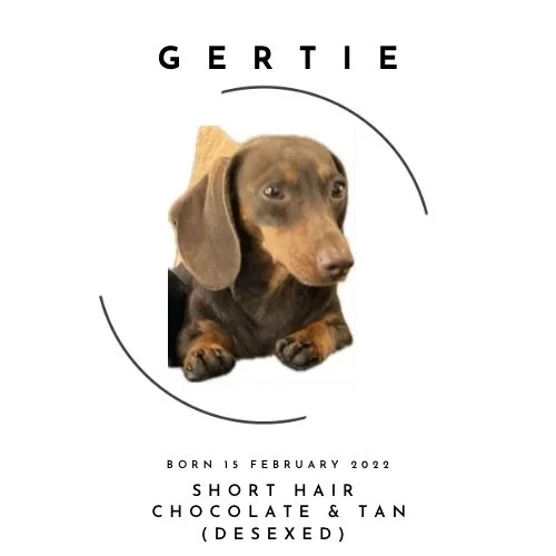 The Loveable patriarch of the family. Loves nothing more than to chase a ball. Freidrich was the first of the Dachshunds. He chose me to be his mother after I said “ no more dogs” lol He is a tweenie, and is very masculine. He is the boss of all dogs except Lettie. He is the father of Gertie.